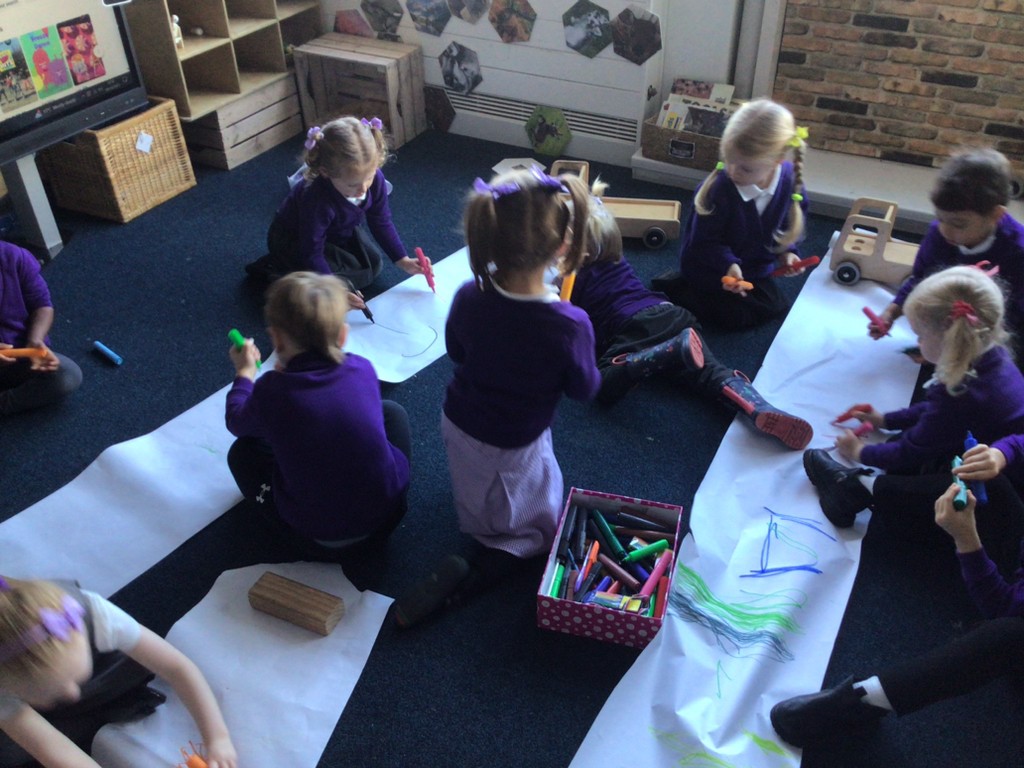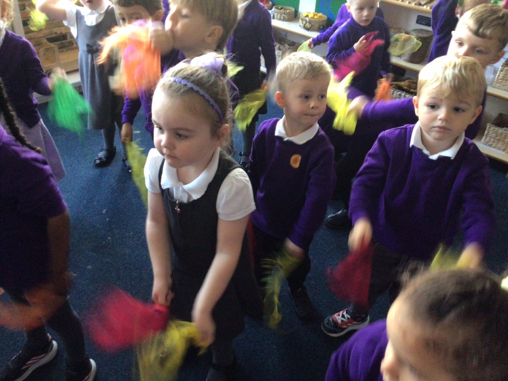 In Nursery, we use Squiggle Whilst You Wiggle to help children develop early mark-making skills. This approach supports the first steps in writing by encouraging children to practise large, controlled movements before transferring them to paper. During sessions, children hold small pieces of fabric in each hand and follow the teacher’s gross motor movements to music. These movements may include going up and down, side to side, making circles, or creating wavy lines. Once children are confident with these actions, they repeat them using thick pens on paper. Over time, the marks they make begin to connect with the themes we are exploring. For example, during a minibeasts topic, children may practise wiggly lines before using them to draw a worm. These sessions are energetic, engaging, and enjoyable, while also building the motor control and confidence needed for early writing.