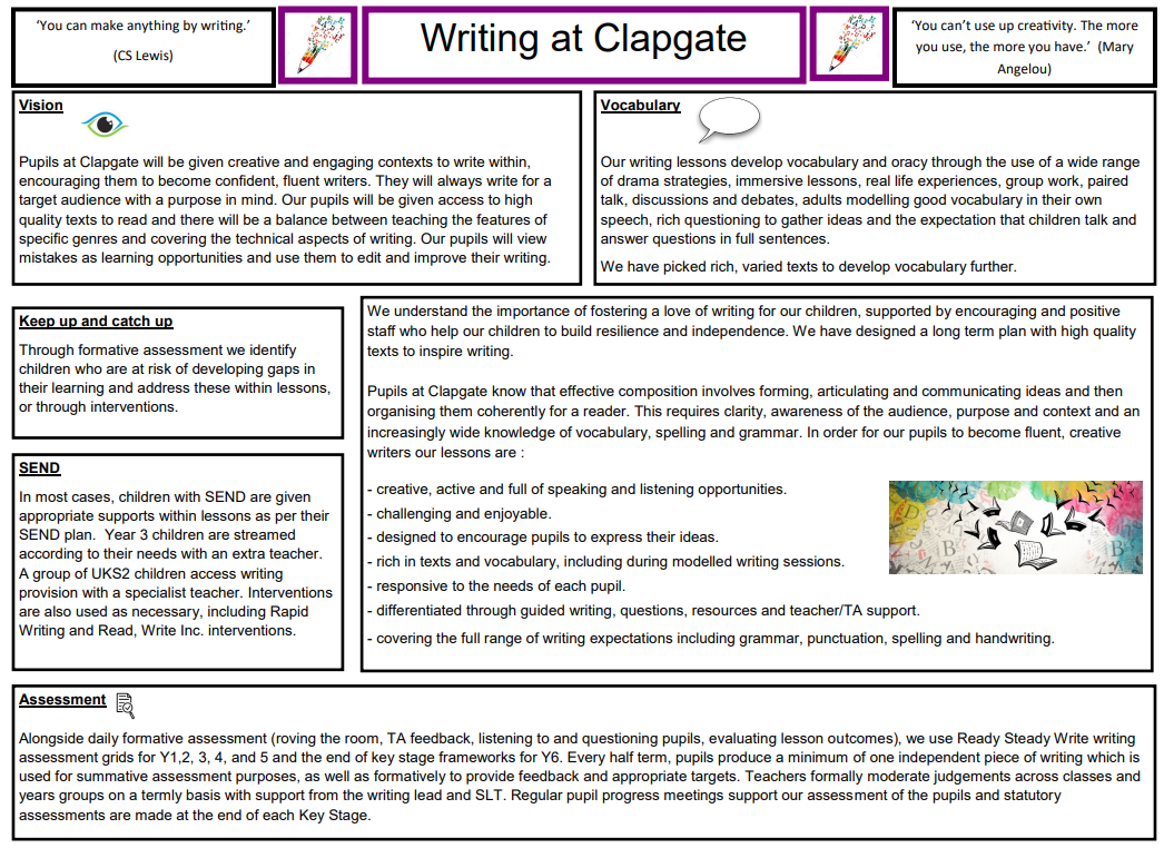 As C.S. Lewis said, “You can make anything by writing.” Our aim is to ensure that our pupils leave Clapgate at the end of Y6 with writing as a tool with which they can make anything.